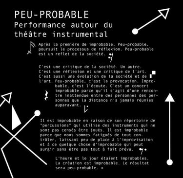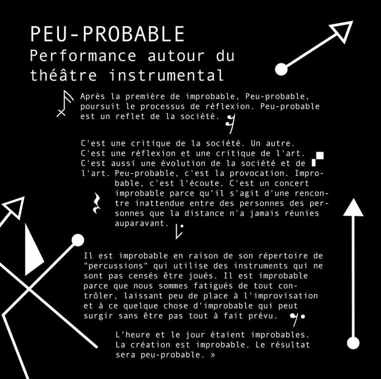 Es poco probable debido a su repertorio de "percusión" que utiliza instrumentos que no están destinados a ser tocados. Es improbable porque estamos cansados de controlarlo todo, dejando poco espacio para la improvisación y para ese algo improbable que puede surgir sin estar del todo previsto.