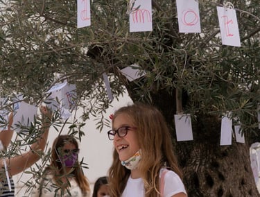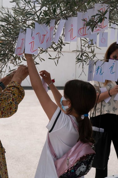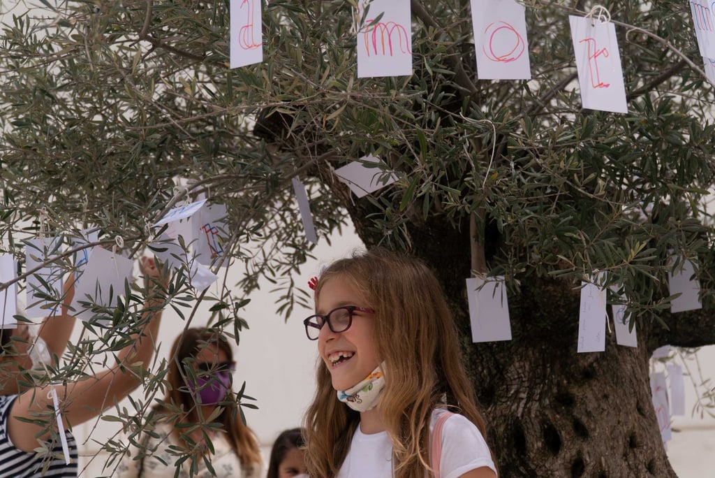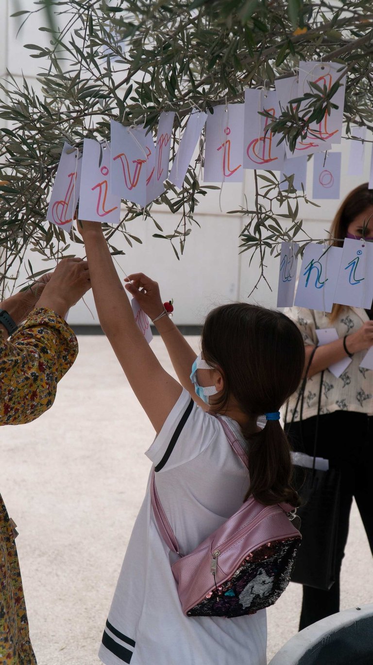 Finalmente, la última fase de la actividad consiste, como se señaló al principio, en la intervención en el ‘Árbol de los Deseos para la Paz’, reproduciendo la caligrafía en los papeles facilitados por la artista y así cada niño pudo colgar su palabra en las ramas del arbol.
