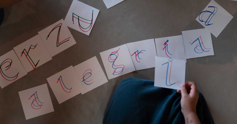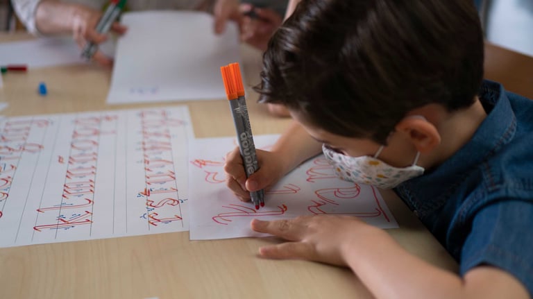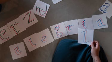 En una segunda fase, para plasmar lo que habían aprendido, se les proponía trazar las letras en unos folios cortados en cuadrados donde escribirian cada uno su palabra para la paz. Cada letra se escribía en un cuadrado.