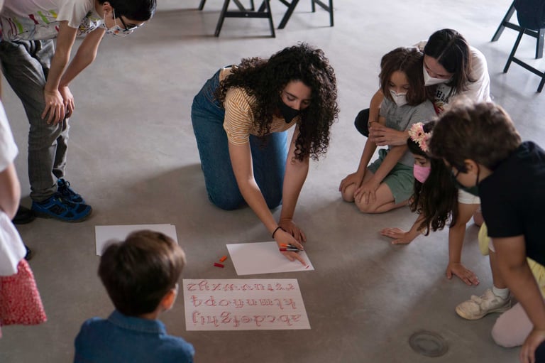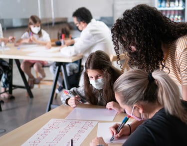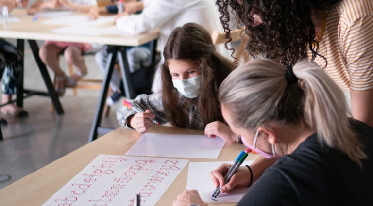 Durante el taller se pasa mesa por mesa explicando y ayudando con la técnica y los dos rotuladores, el ángulo necesario, una buena elección de colores, un uso correcto de la plantilla para la proporción de la caligrafía y el orden en el que debemos trazar.