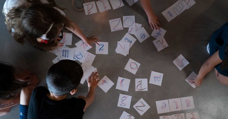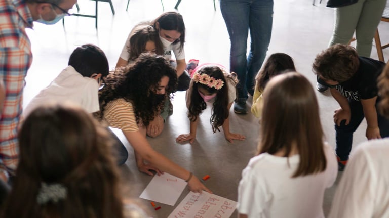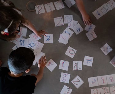 Con esas palabras se les propuso un juego: montar todas las palabras en el suelo y después, con las letras, hacer dibujos de la paz. El primer grupo creó el símbolo de la paz y el segundo una paloma de la paz.